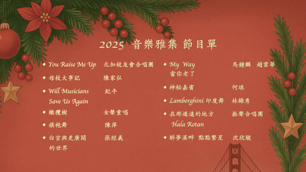 【百年政大 沐光前行】慶祝國立政治大學 2027 年百年校慶,母校振聲合唱團攜手政大校友經典團,將於2027年一月美西巡演;上月初(九月一日)在校長主持下,我們與兩團負責人暨指導老師交換意見,確定舊金山為美西第一站。請持續監督進度,我們需要北加南加乃至全球校友同心協力,百年一日東西一線,側看藝術文化凝聚不老的初心,再顯政大百年念念家國山海風華。